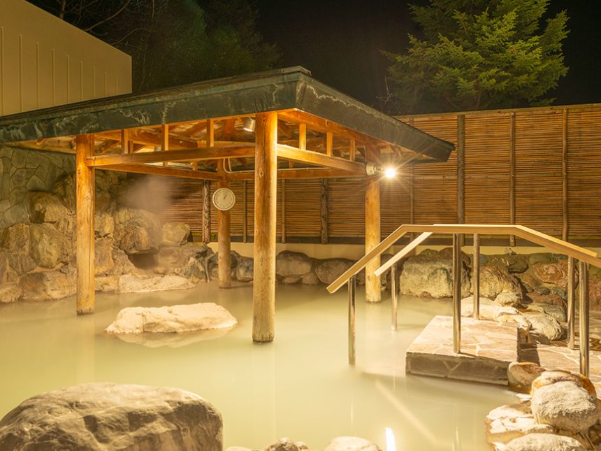 東屋付の情緒ある露天風呂で、硫黄の香り漂う白濁の湯を満喫。国産檜としらかばで設えたセルフロウリュサウナでは、まるで自然の中にいるような空間で一味違う「ととのえ」が体験できます!